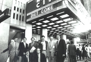 Members of the Diet Coke team beneath the Radio City Music Hall marquee before the filming of the brand’s debut TV commercial.“We needed a big idea to come out of one of the toughest decades we’d ever seen,” Carew explains.